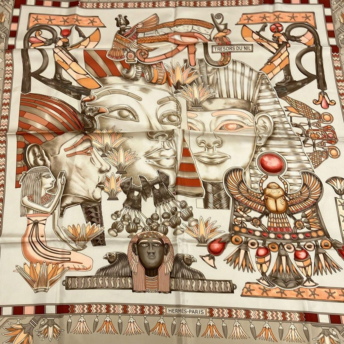 HERMES エルメス スカーフ カレ90 ベージュ×オレンジ×マルチ TRESSORS DU NIL