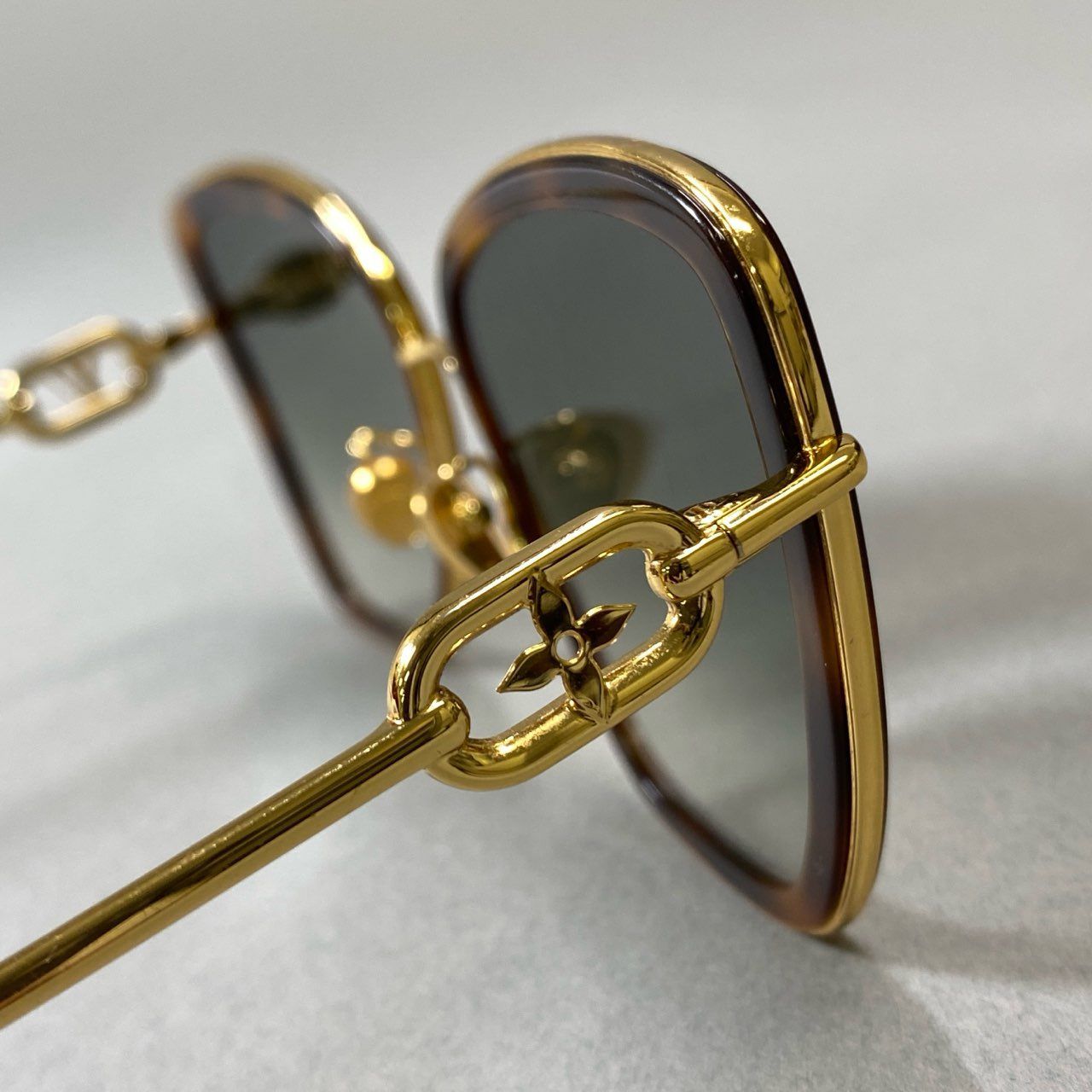LOUIS VUITTON(ルイ・ヴィトン)の「LINK ONE」サングラス。ブラウン×ゴールドのコンビネーションが上品で、リム部分にはべっ甲調の艶やかなアクセント。サイドにあしらわれたLVロゴのメタルモチーフがラグジュアリーな印象を引き立てます。フェミニンなキャットアイフォルムで小顔効果もあり、エレガントな大人のスタイルに最適な一本です。