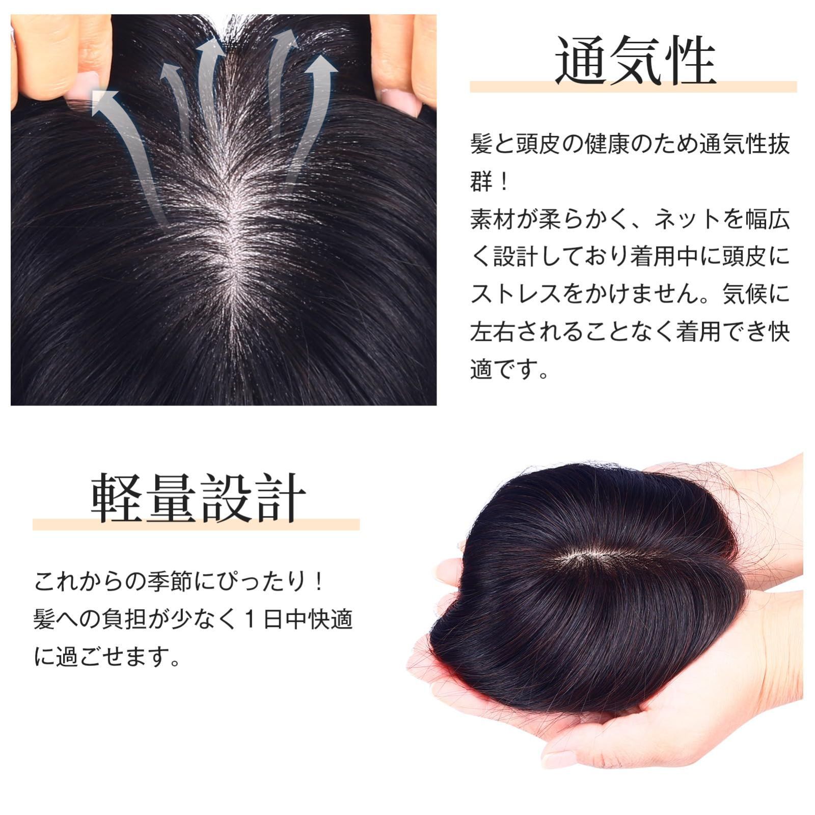 リアルな人工肌:地肌がリアルに再現されており、大きなベースで頭頂部をしっかりとカバーできます。総手植えの製法を採用し、毛がふんわりと自然に立ち上がり、トップに自然なボリュームを出すことができます。