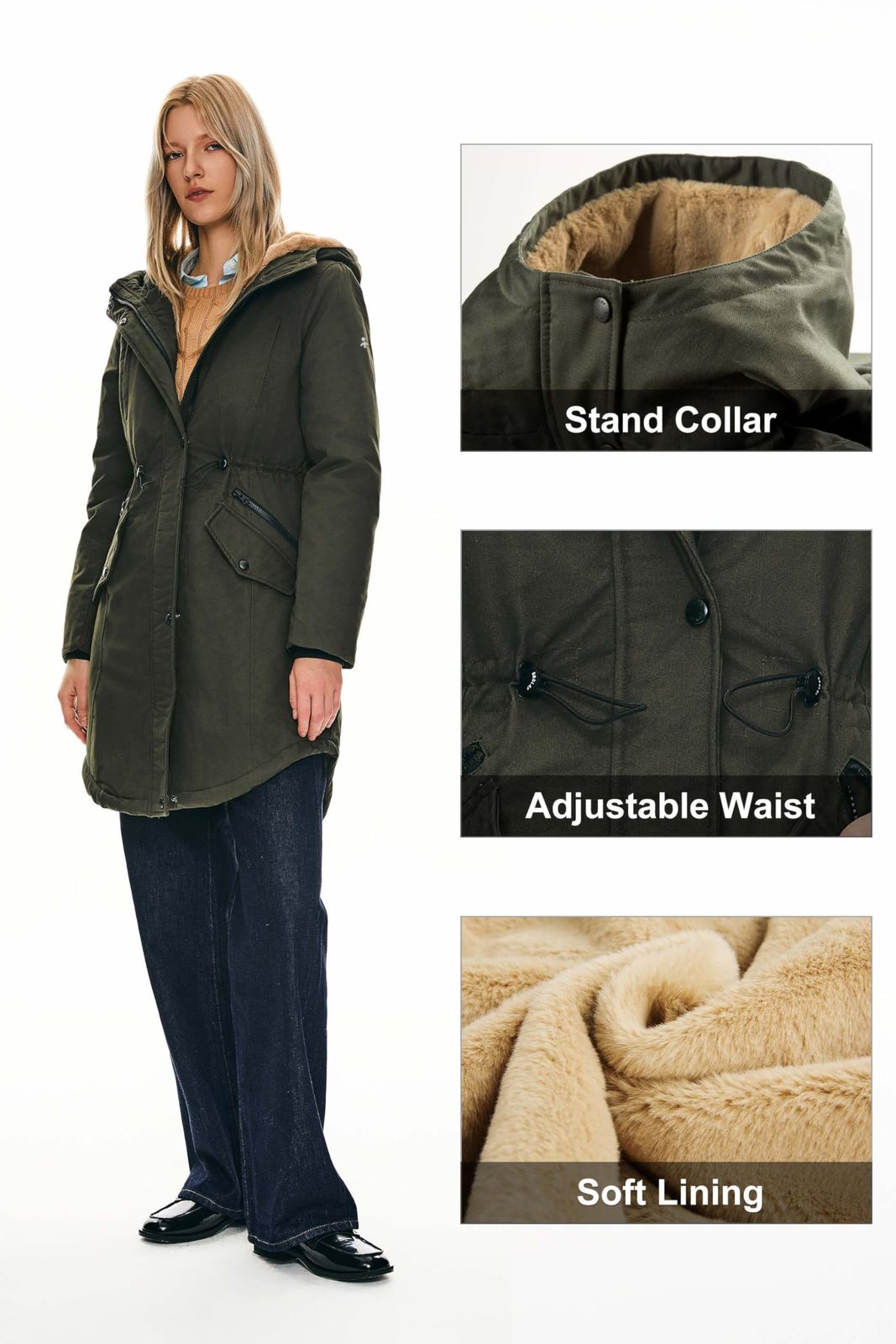 [Orolay] モッズコート レディース 中綿ジャケット ロング アウター ミリタリー ボア 裏側フリース フード付き 撥水 防寒 防風 耐久 膝丈 カジュアル 通勤 通学 秋 冬