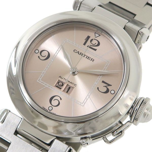 CARTIER(カルティエ)パシャCビッグデイトカルティエの人気モデル、パシャCビッグデイトが入荷致しました。淡いピンクダイヤルに6時位置の大きなデイト表示を配置した視認性の良い時計です。メンズはもちろんのこと大きめサイズをお探しのレディースにもおススメの一本です。当社提携の時計修理工房にて外装の新品仕上げと内部調整を行っております。文字盤中央に小傷、ベゼルに擦れ、ラグ部分に小傷、裏蓋に傷、ブレスレットに擦れがございます。カルティエの人気モデルパシャをお見逃し無く。■整備仕上げ・内部調整■ブレス内径約15.5cm