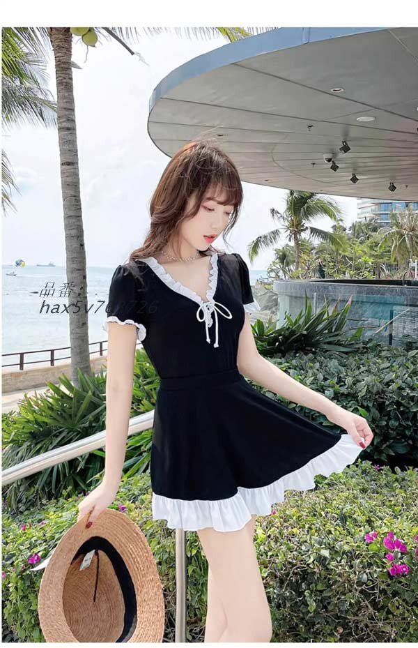 ワンピース水着 服みたいな 水着 2点セット リボン 半袖 フリル ワイヤーなし パッド付 レディース 着〓せ 服みたいな シンプル セクシー 写真映え 撮影用 海 夏 サマー プール リゾート かわいい オシャレ 旅行 温泉 大人 女性用 ジュニア 学生 女の子 ブラック