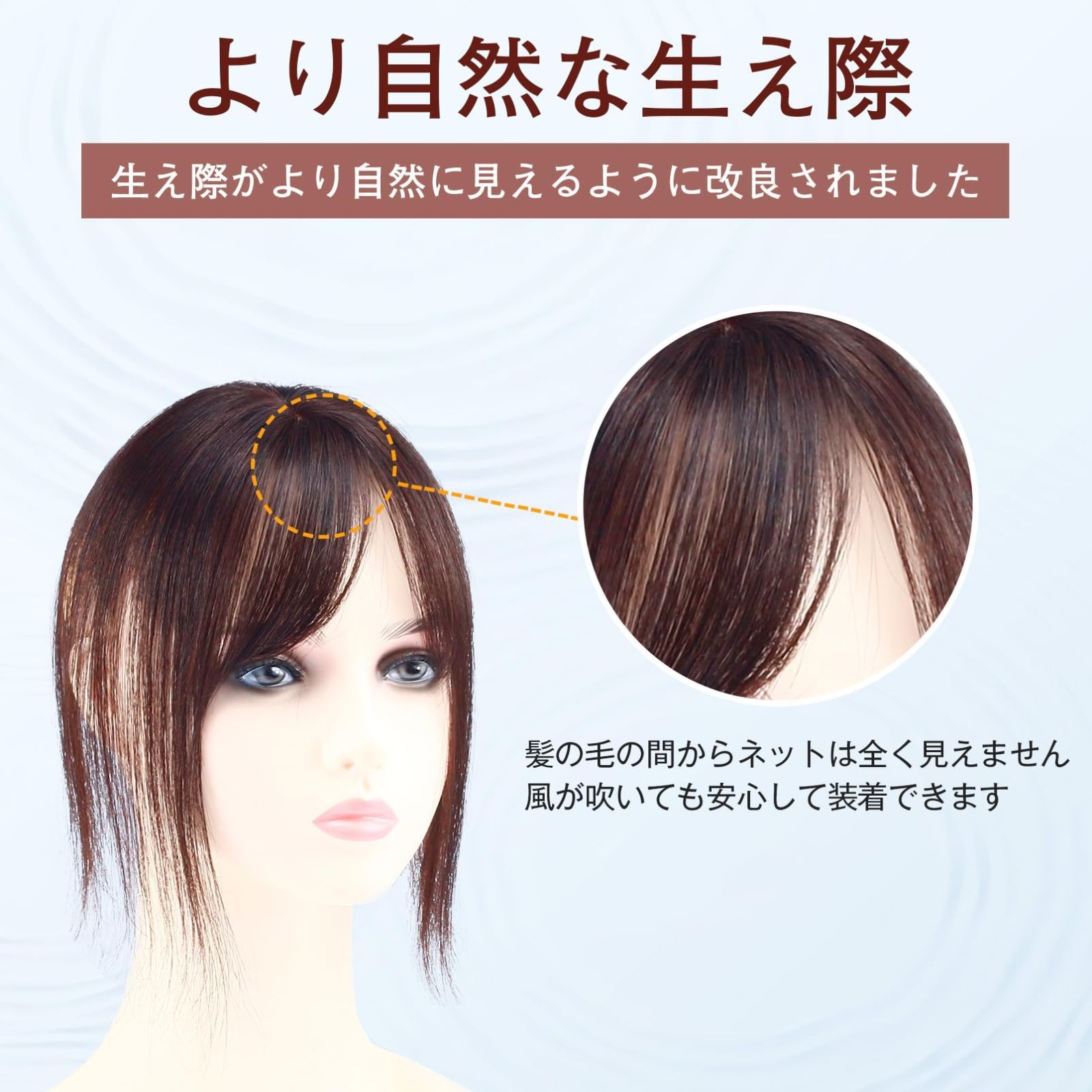 変えられる分け目:人工頭皮は頭皮の模様や色合いに近いデザインであり、装着時にも頭部に自然に馴染みます。分け目は自由で、自分のスタイルやファッションに合わせてウィッグをアレンジすることができます。