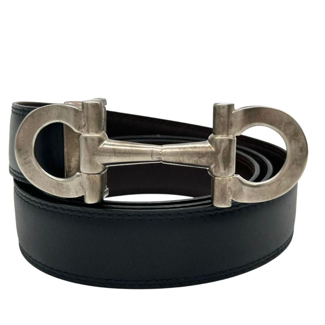 フェラガモのガンチーニロゴが上品に輝く本革ベルト。ブラックのレザーとシルバー金具の組み合わせがシックで洗練された印象を与えます。耐久性の高い素材を使用し、長く愛用可能。ビジネスシーンやカジュアルスタイルのどちらにもマッチし、ファッションの格上げに最適な逸品です。美品のため状態も良好で安心してご購入いただけます。