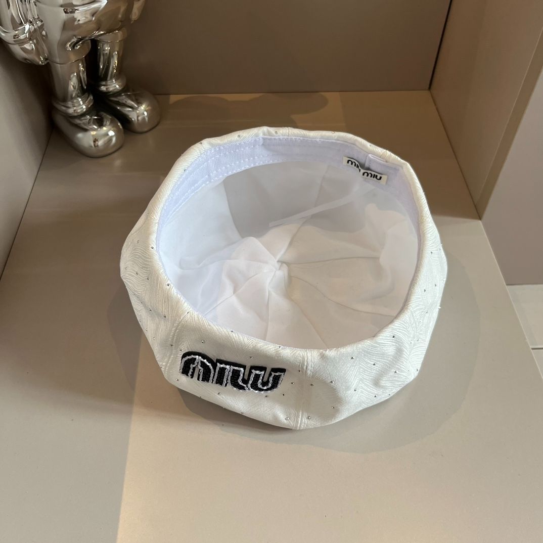 Miu Miu ならではの可愛らしさとファッション感が同居するデザインです。八角形のベレーハットは、伝統的なデザインにミュミュ独自のアイデアが加えられています。ハットには、ミュミュのロゴや独特なデザイン要素が施されており、目立つデザインです。