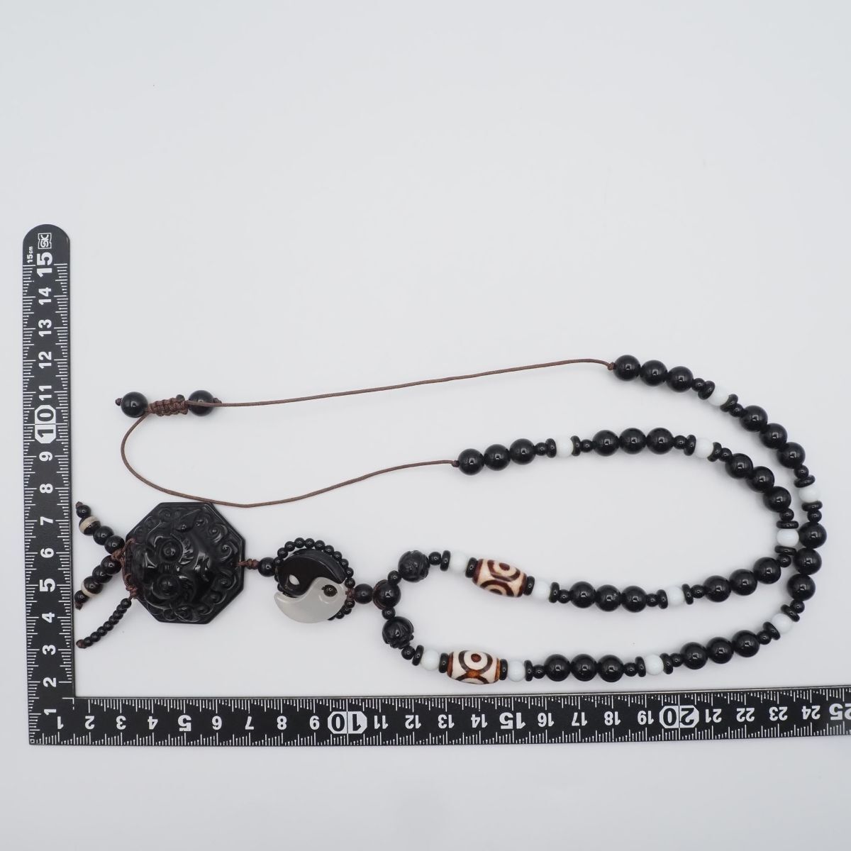 H 509 オニキス ホワイトストーン ネックレス 陰陽太 図 勾玉 獅子彫刻 紐 デザイン アンティーク