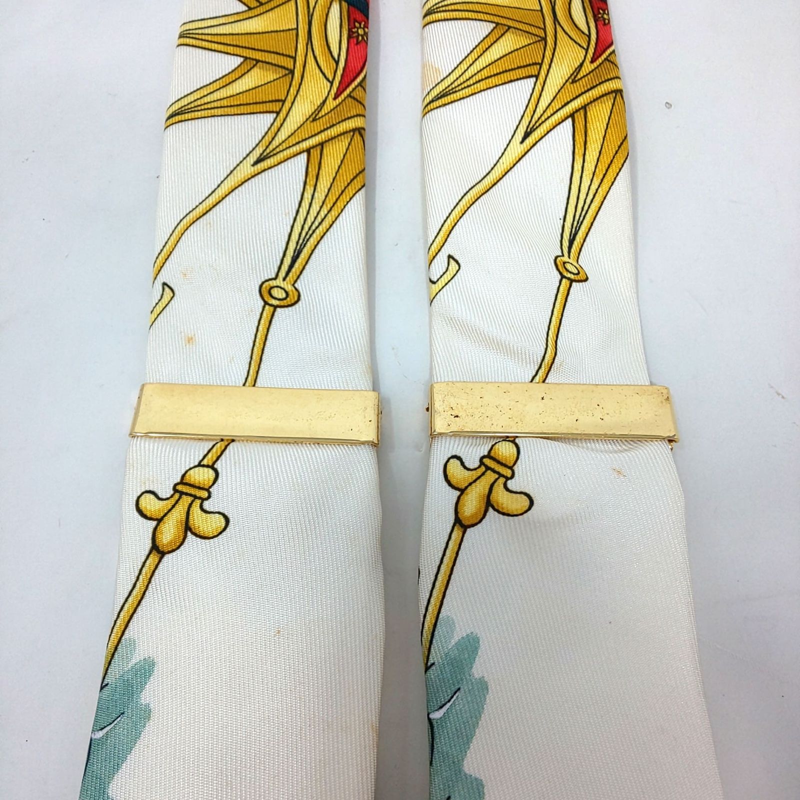 977 A-03 HERMES エルメス シルク サスペンダー レザー 総柄 ホワイト系 ゴールド金具 ブランド 服飾雑貨