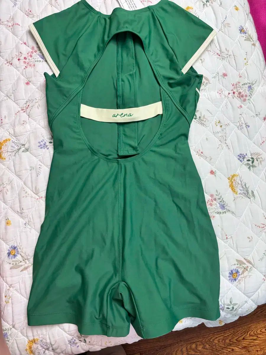これはアリーナウィメンズパート2ハーフボディ水着を使った新品アイテムです。サイズは55からふっくらとした55サイズで、デザインはレトロなグリーンカラーにアイボリーのラインがアクセントになっています。ファスナー付きなので着脱しやすいと思います。チェストキャップもあげるよ