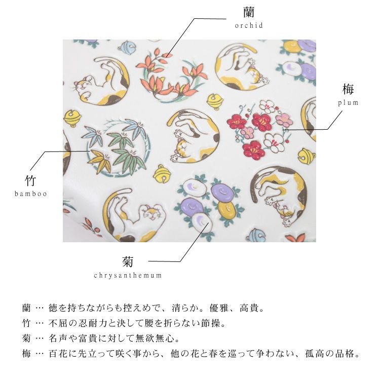 「愛らしい猫」と「格式が高い四君子」を取り入れた創作柄です。花紋に使われている「四君子」とは、春は蘭、夏は竹、秋は菊、冬は梅と、四季ごとの花を彩ったもので、一年中この財布を使っていただきたいとの願いを込めています。愛らしい猫がコロコロと転がる間に格式の高い四君子をあしらった可愛らしい模様。可愛らしさと上品さが見事に調和した浅草文庫の創作柄となっております。
