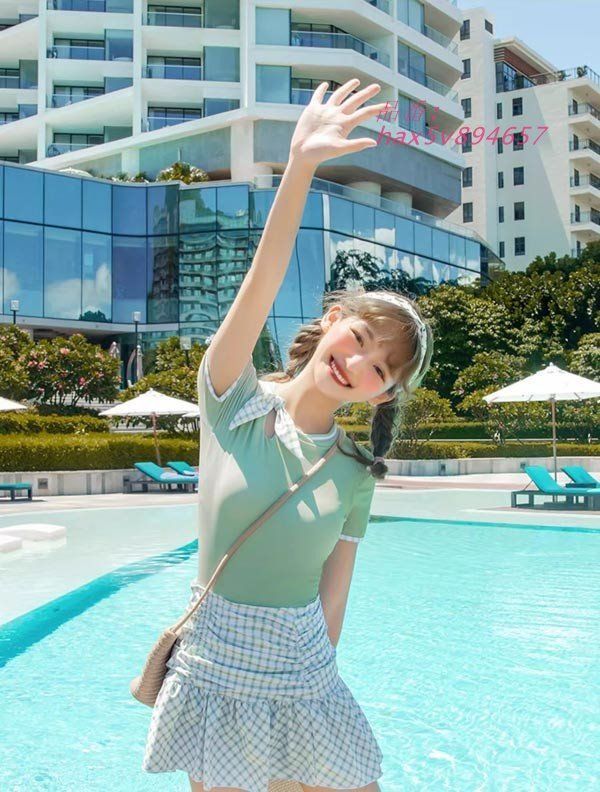 ワンピース水着 リボン 服みたいな 水着 チェック柄 半袖 ワイヤーなし パッド付 レディース 着〓せ シンプル セクシー 写真映え 撮影用 海 夏 サマー プール リゾート かわいい 透け感あり 旅行 温泉 大人 女性用 ジュニア 学生 女の子 グリーン