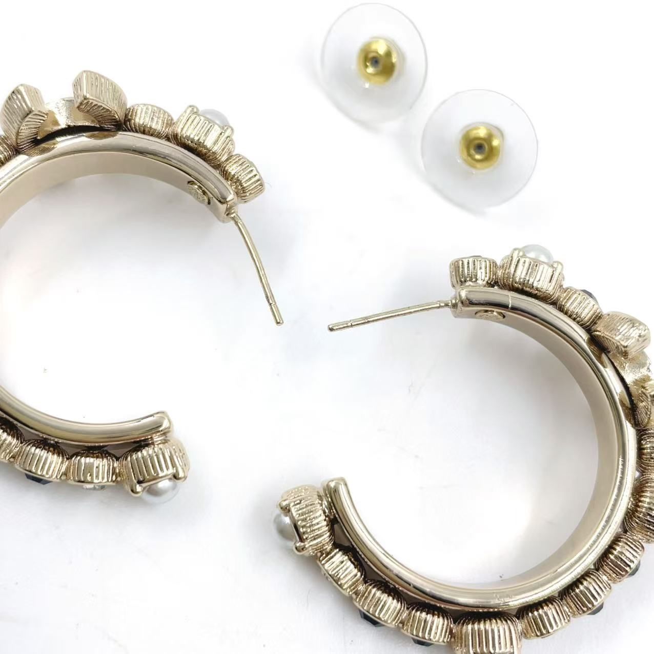 【商品名】CHANEL Fall Winter 2023 メタル×ラインストーン×フェイクパール ブラック×ホワイト ピアス ゴールド