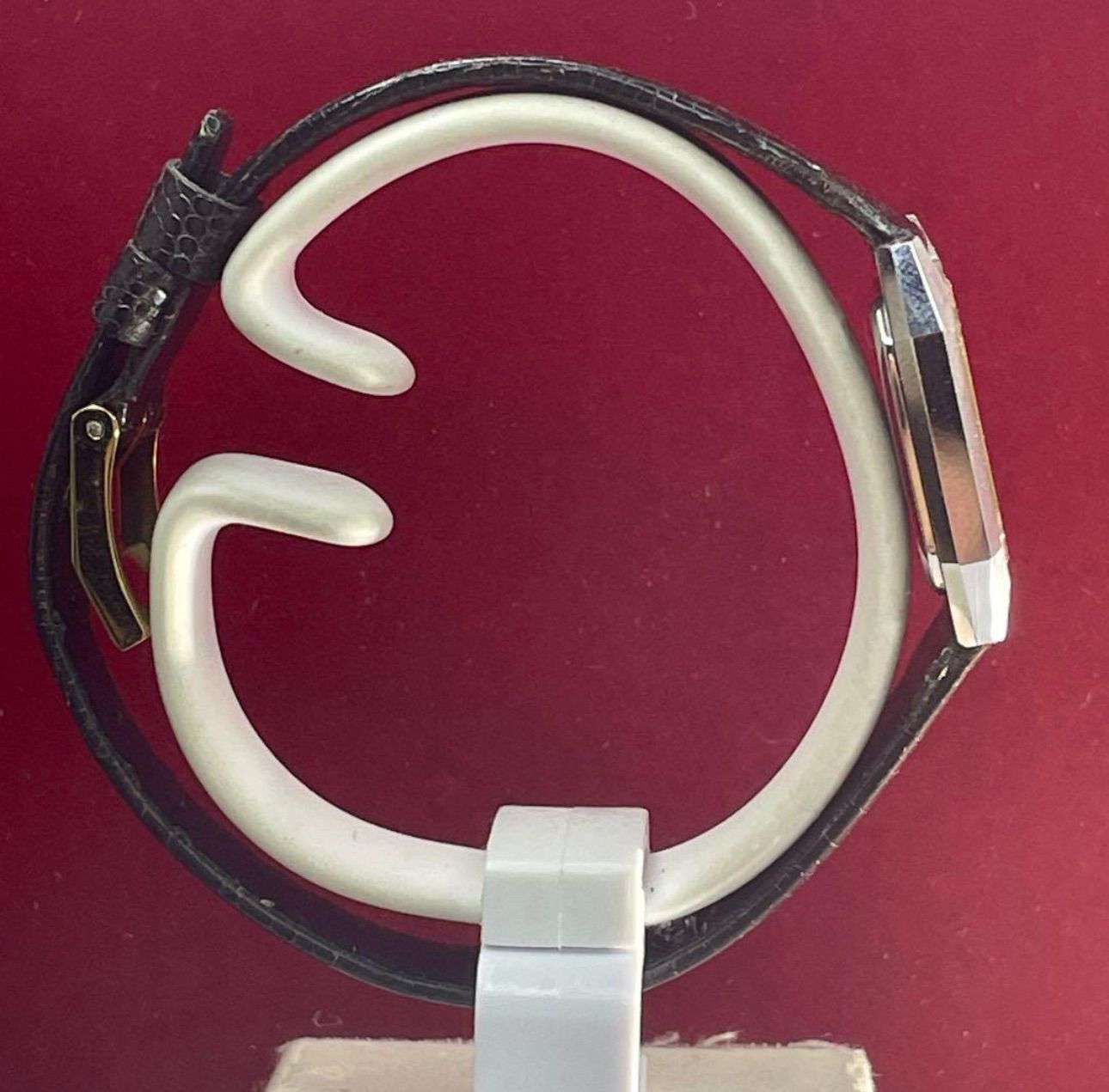 レクタンギュラーケースにゴールド色のベゼル、シルバーミラーダイヤルにゴールドのインデックスというデザインはとても高級感に溢れています。