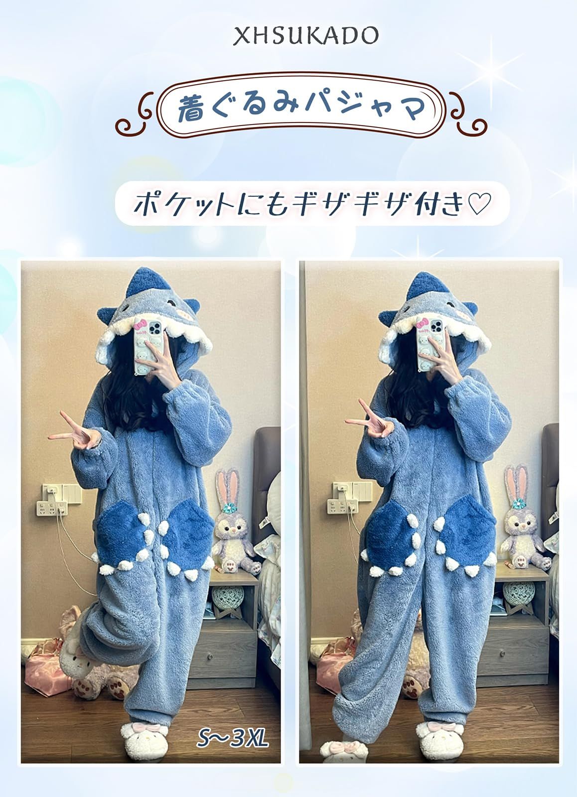 [XHSUKADO] かわいい サメ 着ぐるみ パジャマ レディース メンズ おもしろ しっぽ 手袋付き フード付き ふわふわ もこもこ あたたか 防寒 ゆったり ルームウェア 部屋着 オールインワン