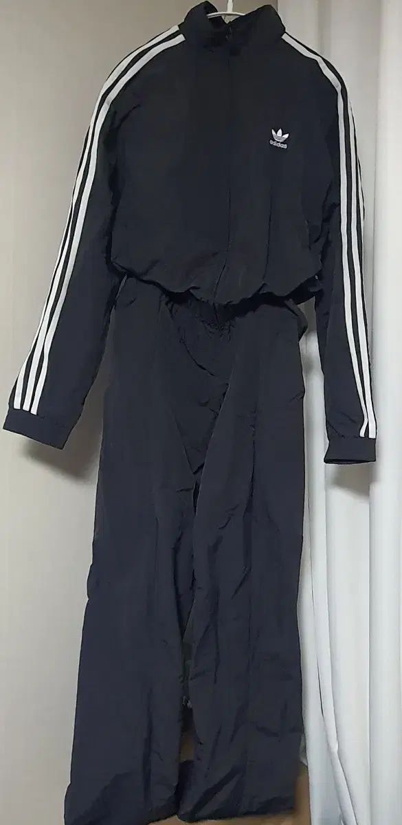 adidas original ウィメンズ オールインワンです。バスト実寸55 総丈150 表記Lサイズでシャカシャカ素材のナイロンで、ブラック カラーにadidas 3本線 POINTが入っています。ウエスト LINEも絞ってあるので、着膨れせずきれいです。裾 シャーリングで調節可能で、ウエスト バンドで楽に着用できます。ズボン 裾の方に少し 汚れありで安く 出品しますが、他の 傷なしは 良好です。神経質な方はご遠慮ください。