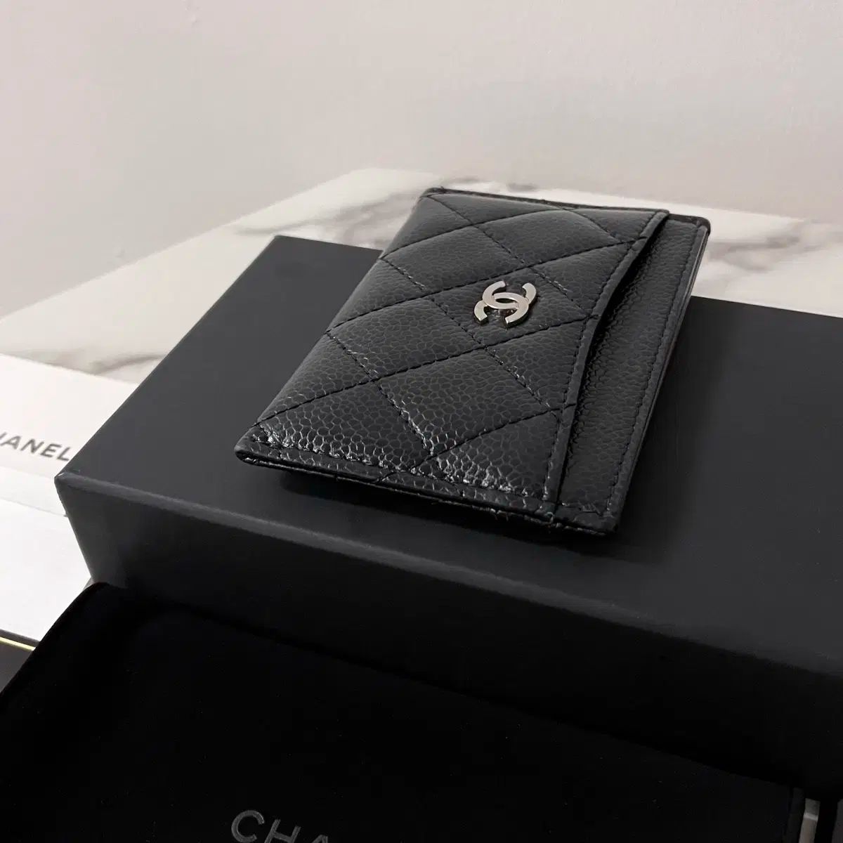 S級 CHANEL Classic グレインド シルバーメタルロゴ カードウォレット