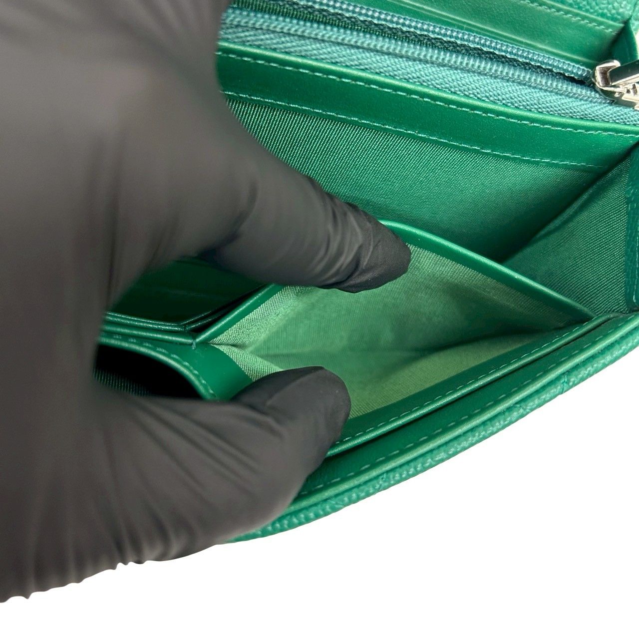 箱 袋付き カード シール有 30番台 CHANEL シャネル マトラッセ ココ キャビアスキン レザー 長財布 ウォレット グリーン 74528