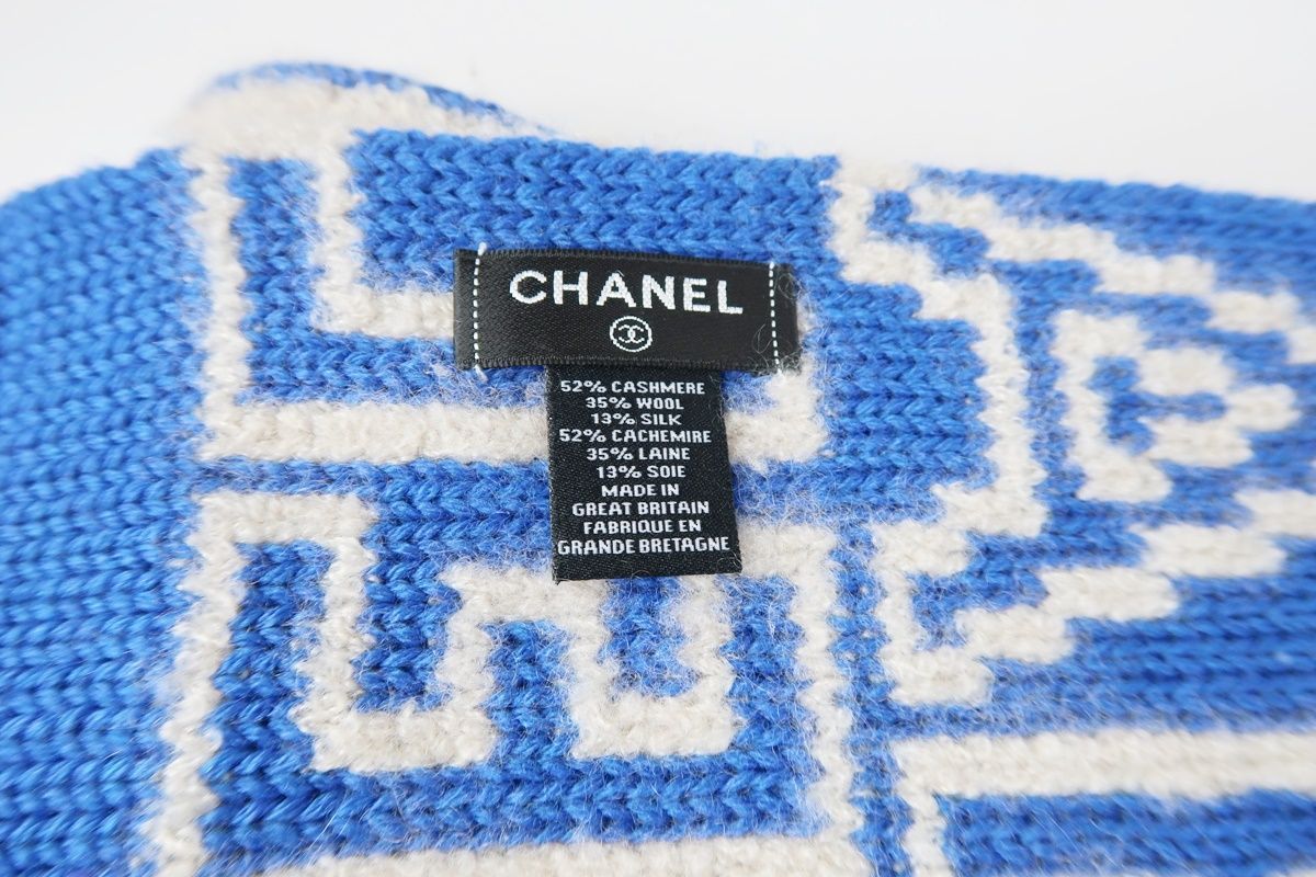 【超美品】CHANEL シャネル マフラー カシミヤ ウール シルク 214×35 ブルー系 ココマーク【QJ98】