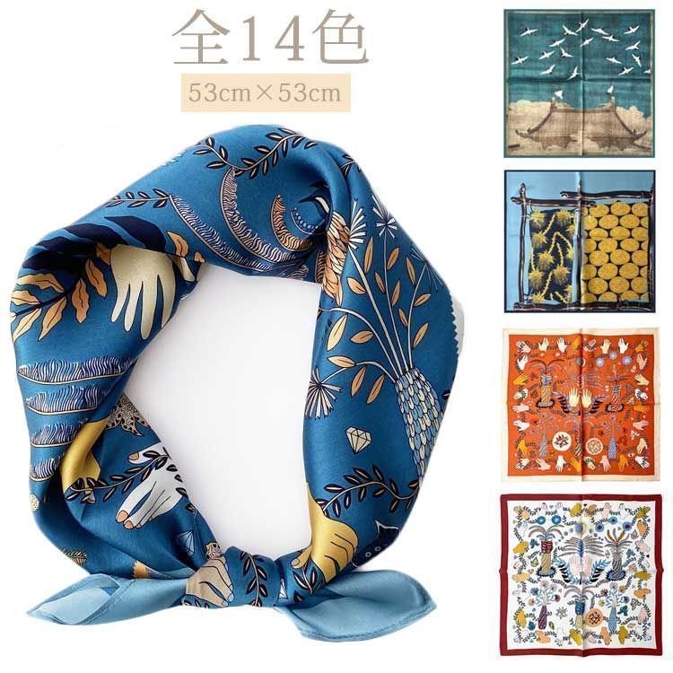 シルクスカーフ シルク100% 正方形 オフィススカーフ ネッカチーフ 絹 プリント 53 cm×53 cm ネックスカーフ 小さい 馬 紫外線防止 ギフト きれい色 夏 大人 猫 花柄 cjfj 144935