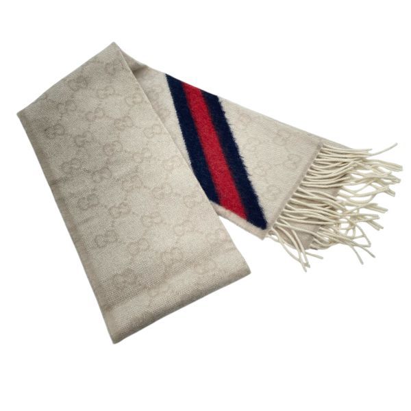 グッチ GUCCI マフラー GGパターン ウェビングライン フリンジ ライトベージュ ウール混 アルパカ混 レディース 5 E 193