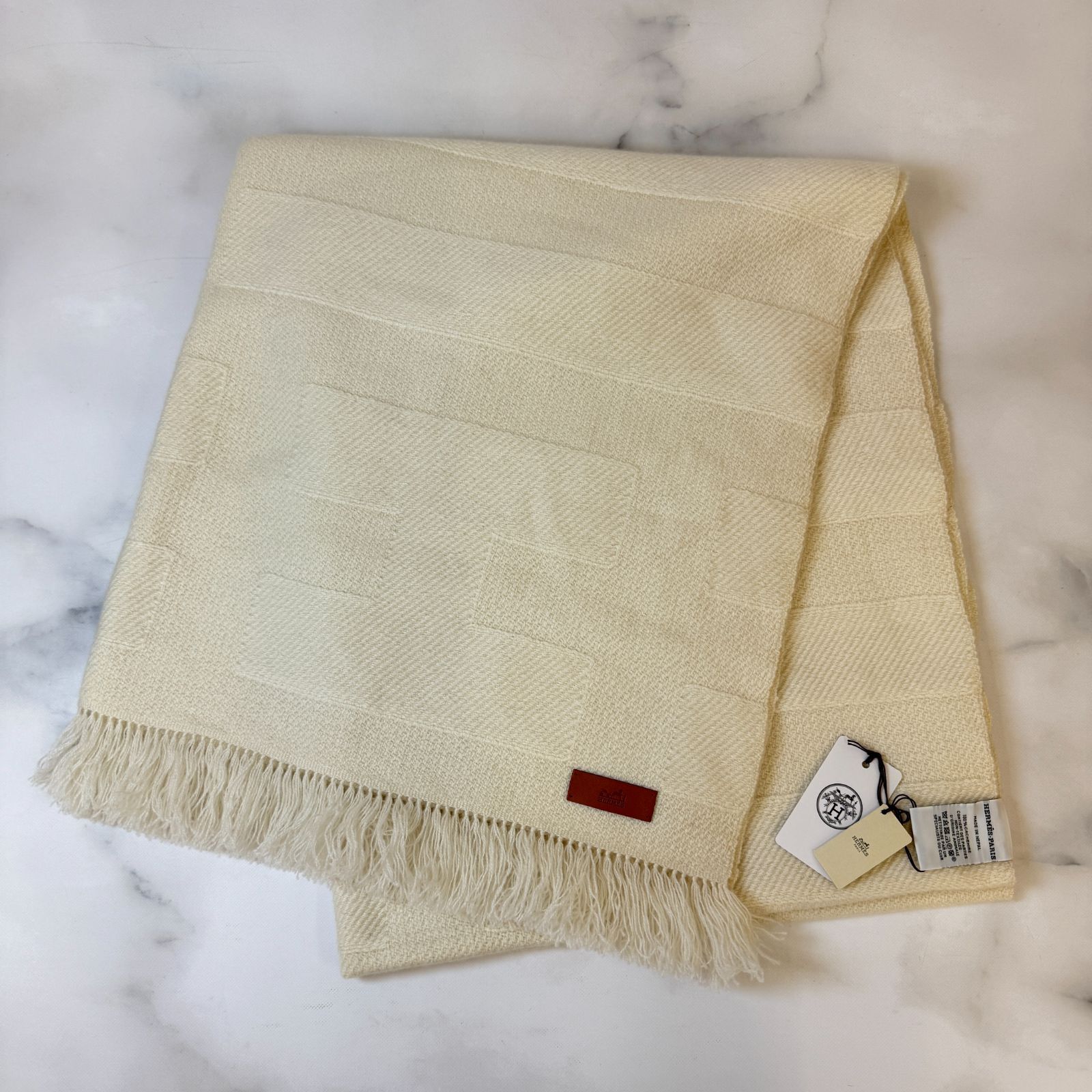 鑑定済み エルメス レイエH ブラン カッセ オフホワイト カシミヤ100 ストール マフラー フリンジ H文字