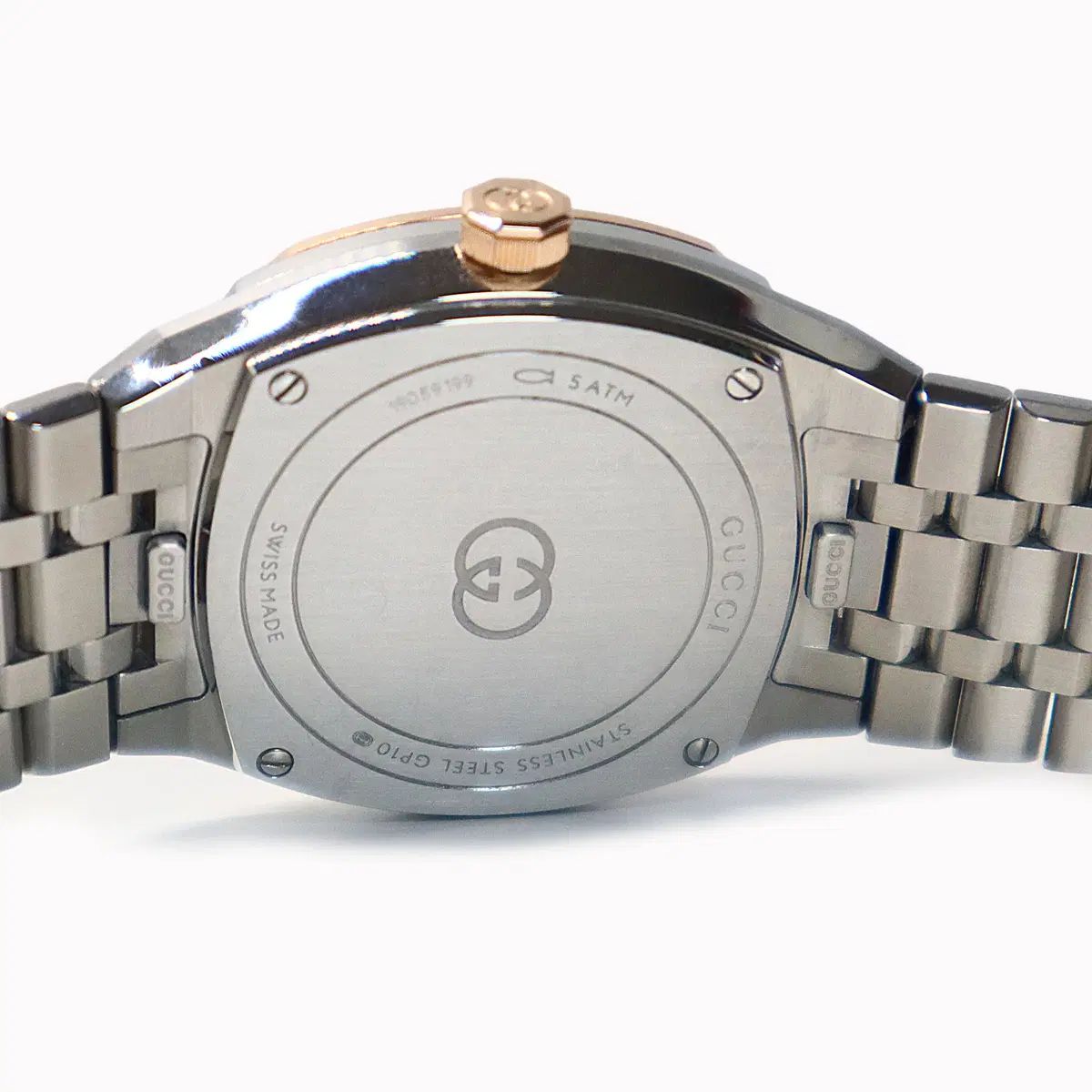 インターロッキング G ディテールをプラスした シルバー ダイアル、グッチ ロゴ および 日付 ディスプレイ、サファイア グラス、反射 防止 コーティング、