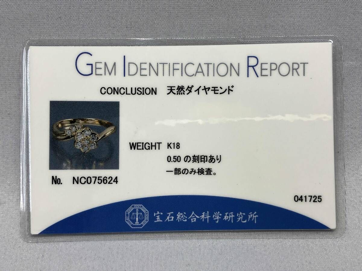 K 18 天然ダイヤモンド 0.50の刻印あり リング 20号 4.8 g ソーティング付 フラワーモチーフ クラスターセッティング ひねり腕