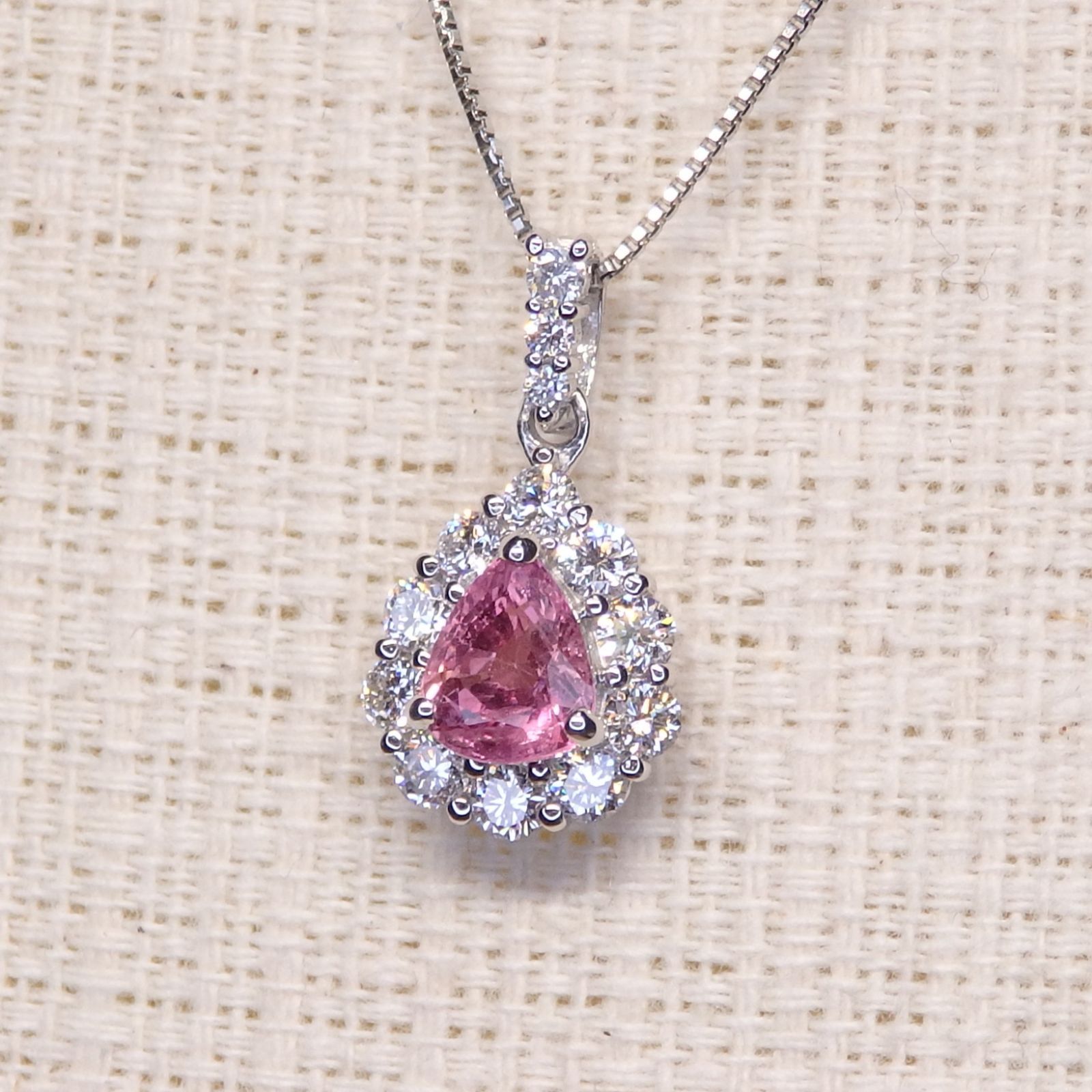 ペアシェイプのピンクサファイアをメインにセットし、バチカン部分と中石の周りには、ダイヤモンドがセッティングされ、豪華な仕上がりのペンダントトップになっております。