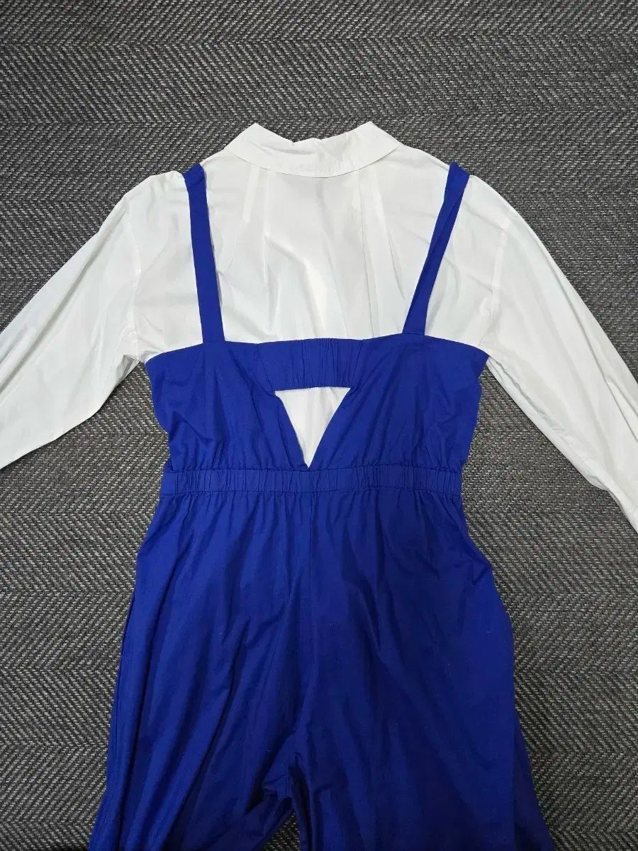 COSブルーサスペンダーワイドジャンプスーツ。涼しいブルーのウエストバンドが着心地を良くします。ご不明な点がなければ、すぐに安心してお支払いいただけます!