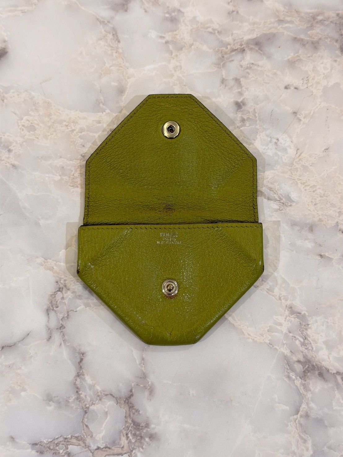 オリーブグリーンのレザー製二つ折りコインケース、スナップボタン付きでコンパクトなデザイン。
