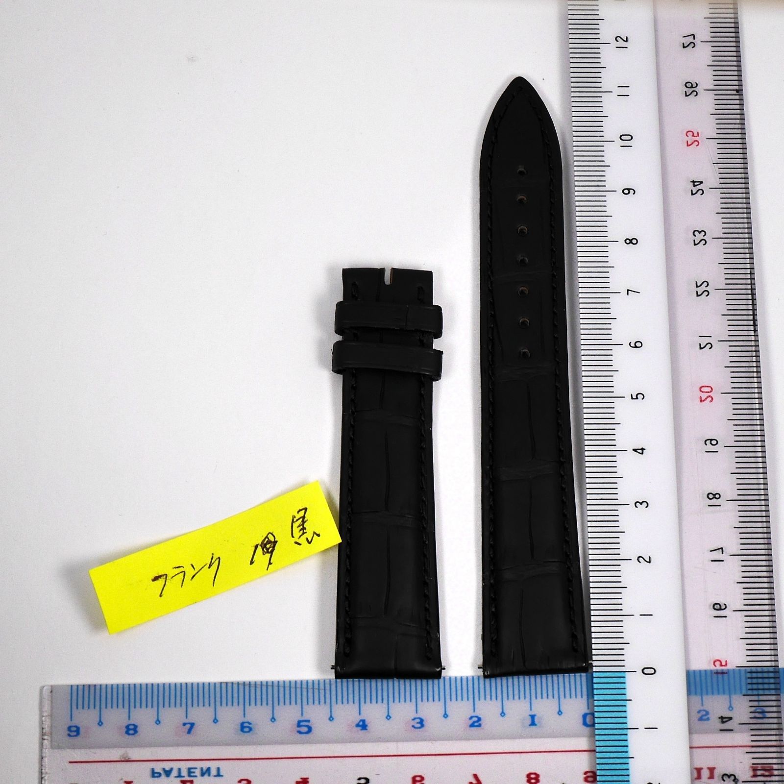 黒色のクロコダイル (ワニ革) を使用した高級レザーストラップ。表面に特徴的な鱗模様が入り、ステッチが丁寧に施され、耐久性と上品さを兼ね備えています。