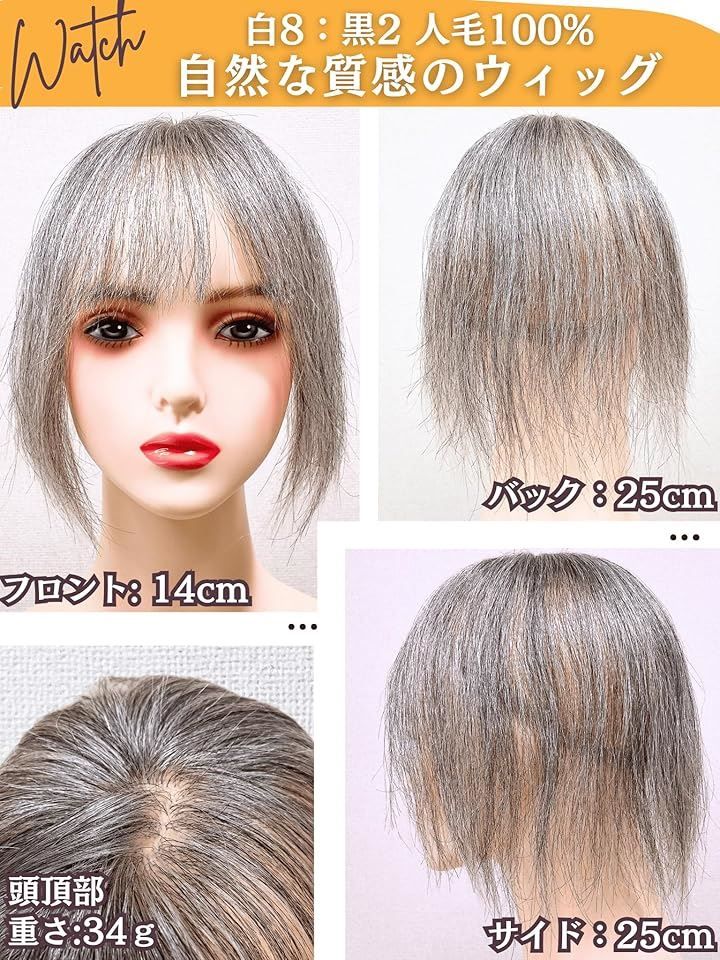 「商品詳細」(2)サイズ:フロント 13cm / サイド 15cm / バック 15cm ベースサイズ:縦18cm / 横16cm (3)重さ:約50g (4)カラー:白5:黒5, 白2:黒8 (全部で2種類カラーございます) (5)対象: レディース 女性 医療用 プレゼント 中高年 (7)用途: うぃっぐ ウィッグ かつら 部分ウィッグ