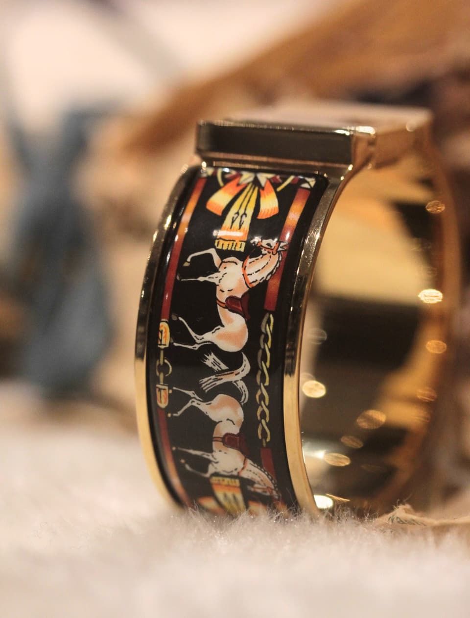 [Brand] HERMÈS [Material] Plated [Color] Gold / Émail (enamel cloisonné) [Case Size] Approx. 12mm (H) × 18.5mm (W) × 5mm (thickness, excluding crown) [Wrist Size] Approx. 14cm (oval shape) [Weight] Approx. 56g [Movement] Quartz [Dial Color] Gold [Bracelet Color] Émail (enamel cloisonné) [Display Type] Analog [Accessories] Box included (not the original Hermès box) [Warranty Period] 6 months
