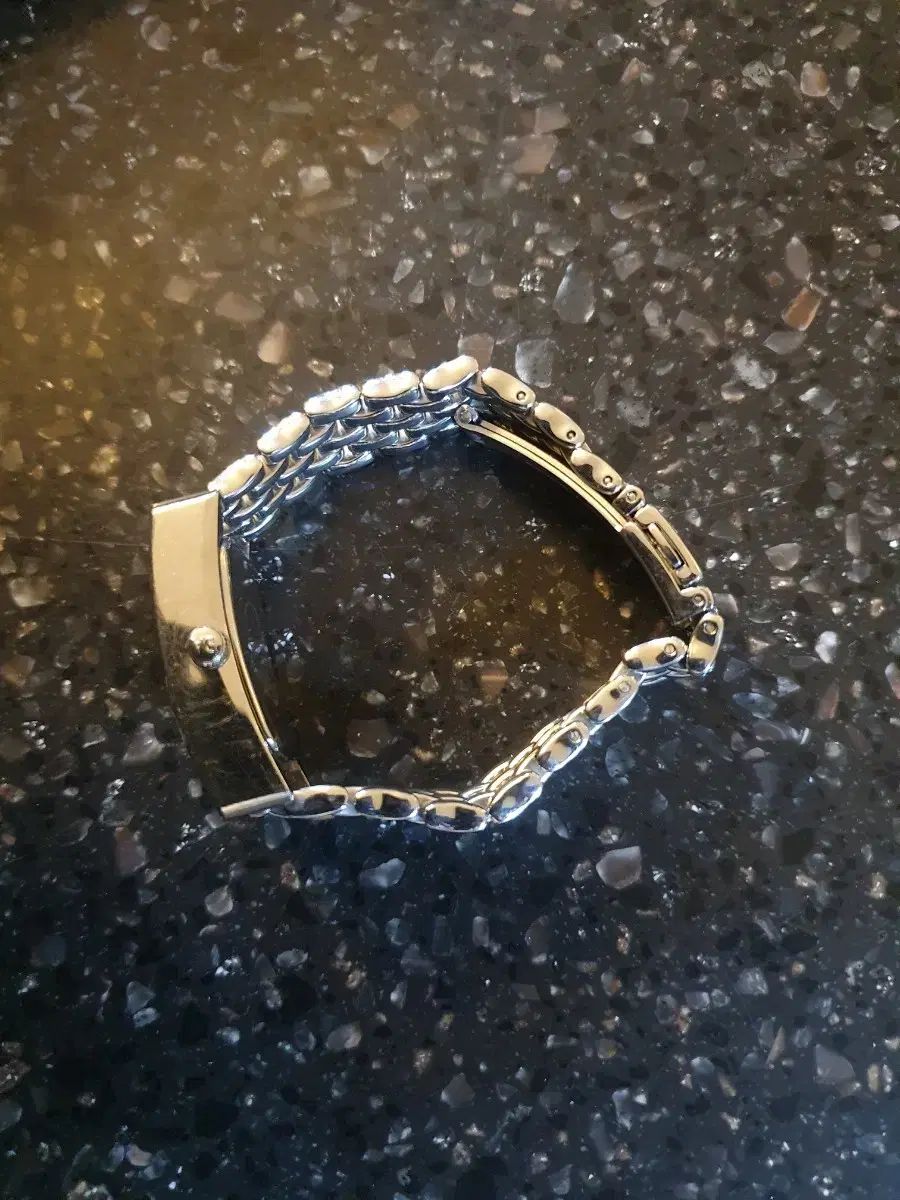 これはエンポリオアルマーニ正規品女性用時計です。この時計にはシルバーのメタルバンドと魅力的なライトピンクの四角いフレームが付いています。