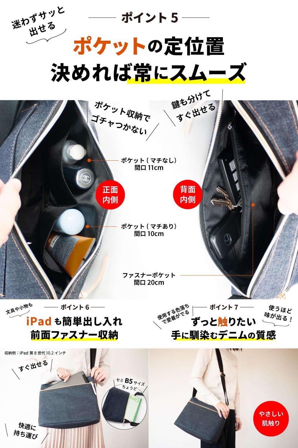 ??【デニム好きには、たまらない】あなただけの色落ちを楽しむ。ショルダーバッグ??マチが広く大容量??自立するので立てて置ける。??内ポケット多数でスマートに整理しやすい ??バッグの中がスッキリ。??世界でも名高い日本製デニムから厳選したデニム生地を使用したショルダーバッグ ??この高品質なデニム生地は、海外のモノを圧倒する品質レベル。腕利きの職人が一切の妥協を許さない??使い込むほど味が出る ??色落ちの風合いは、一般的なデニム生地と比べものにならない。自分だけのオンリーワンに育てるならコレ。??iPadも簡単出し入れ前面ファスナー収納 ??快適に持ち運び。??軽快に動くときの斜めがけに最適?? 長さ調節可能で好みのスタイルに。??サイズ、 約29cm 縦 約22cm 厚さ 約15cm ■重量、約420g(肩掛け紐含む)