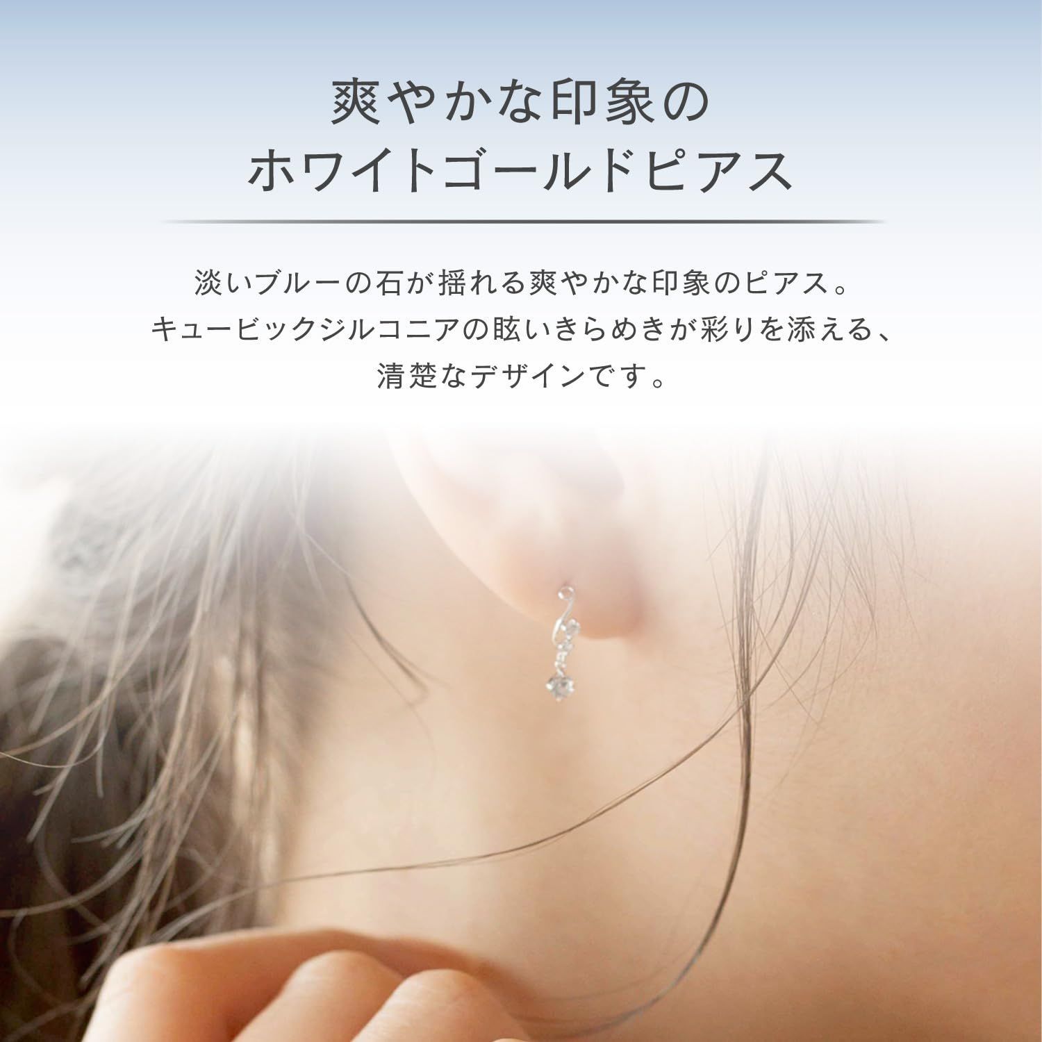 淡いブルーの石が揺れる、爽やかな印象のピアス。キュービックジルコニアの眩いきらめきが、さらなる彩りを添えます。清楚な女性らしさを引き立てるデザインです。