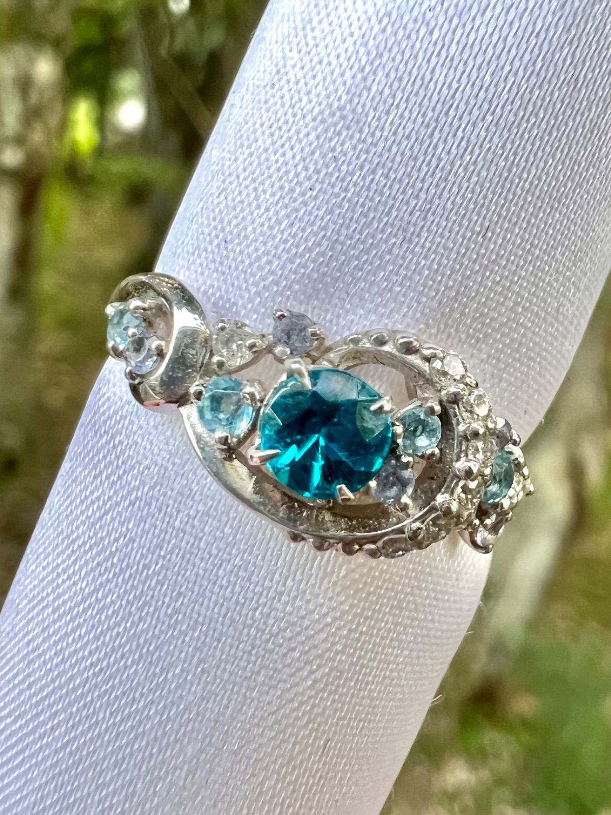 そのとても主張の強いアパタイトの周りにはダイヤモンドだけではなく淡く優しいカラーのタンザナイト、ブルートパーズを散りばめました。