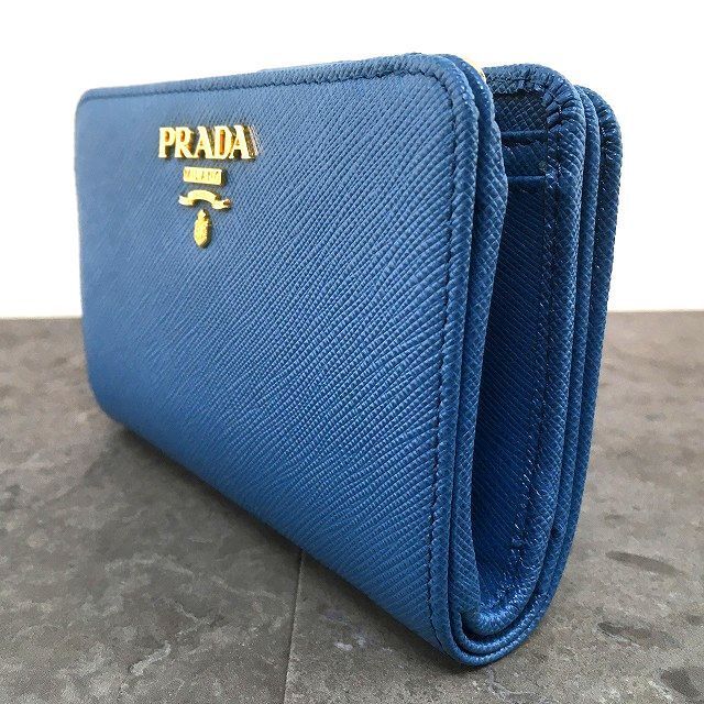 水色レザーにゴールドのロゴが印象的なプラダらしいお財布です。