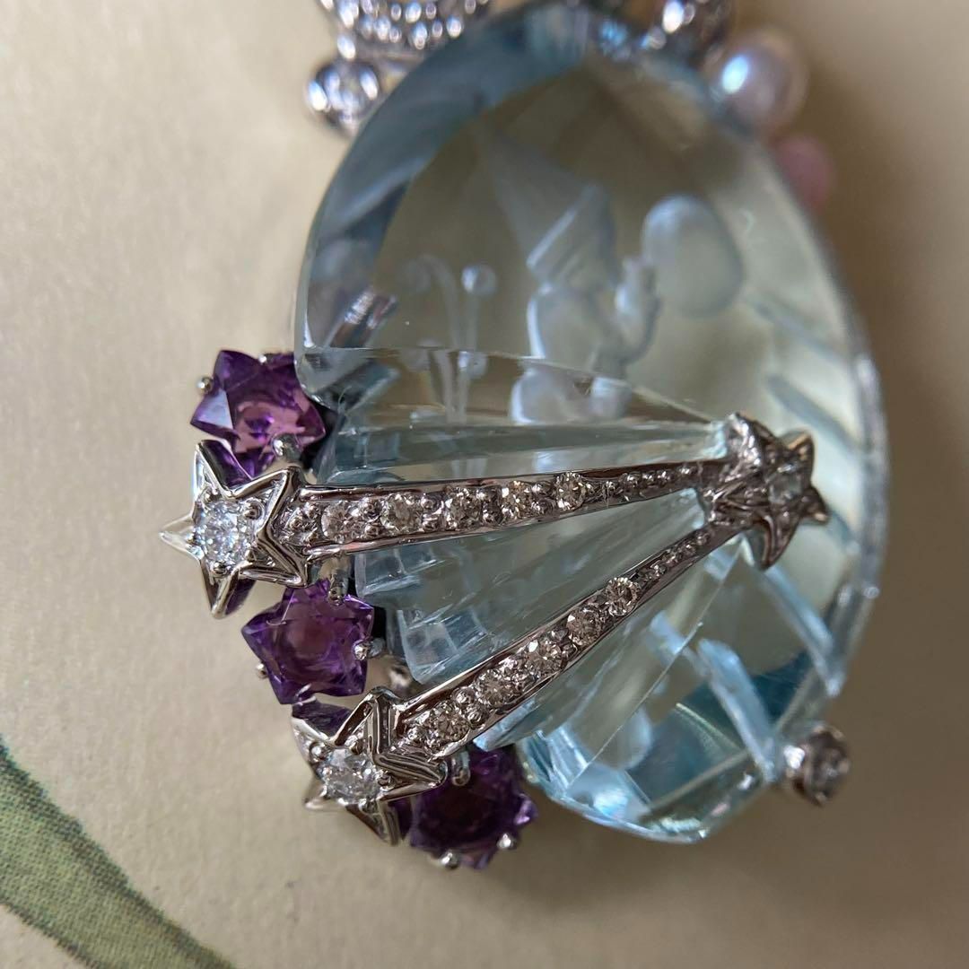 周囲にはピンクオパール、アコヤパール、アメシストが添えられ、星のようなダイヤモンドが優美な煌めきを放ちます。