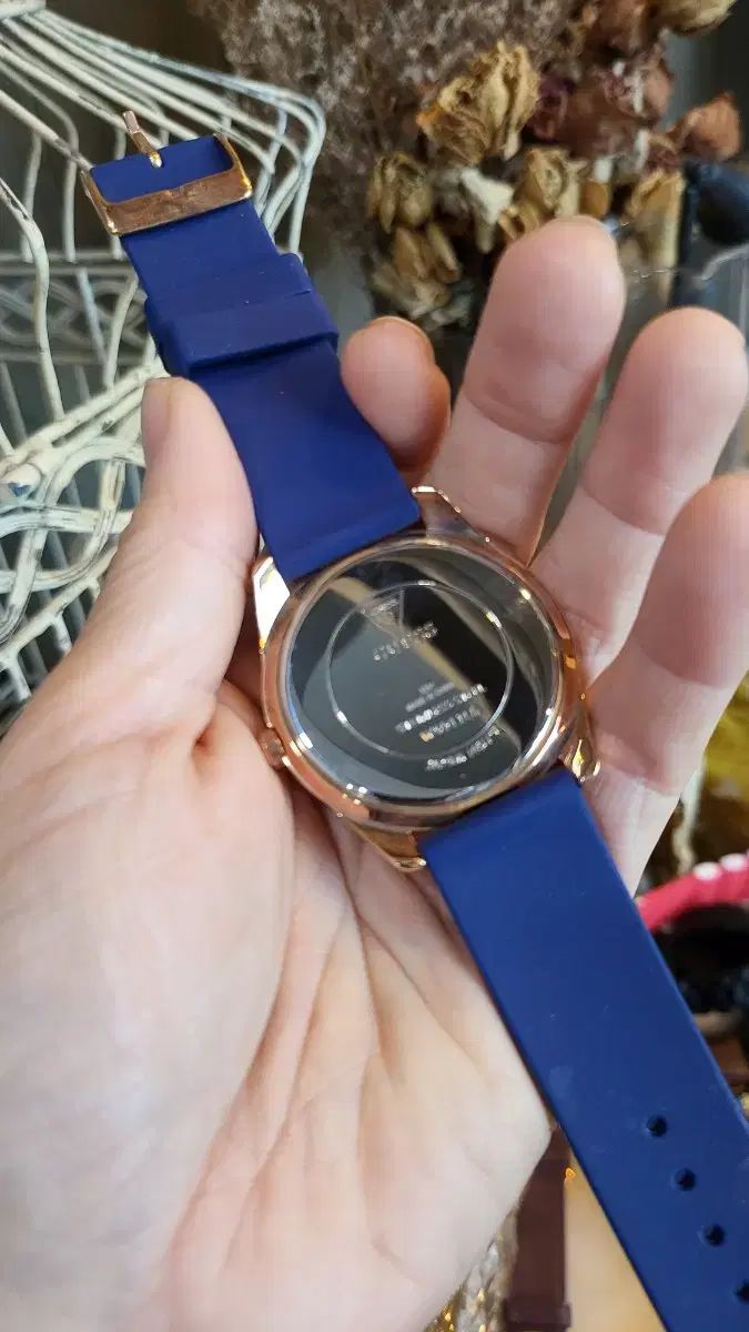 ローズゴールドのケースとネイビーのバンドが付いた魅力的なGuess女性用腕時計です。バンドの材質は金属ではなくゴム製と推定されます。この時計は普段のカジュアルウェアに最適です。ご不明な点がございましたら、すぐにお支払いください。