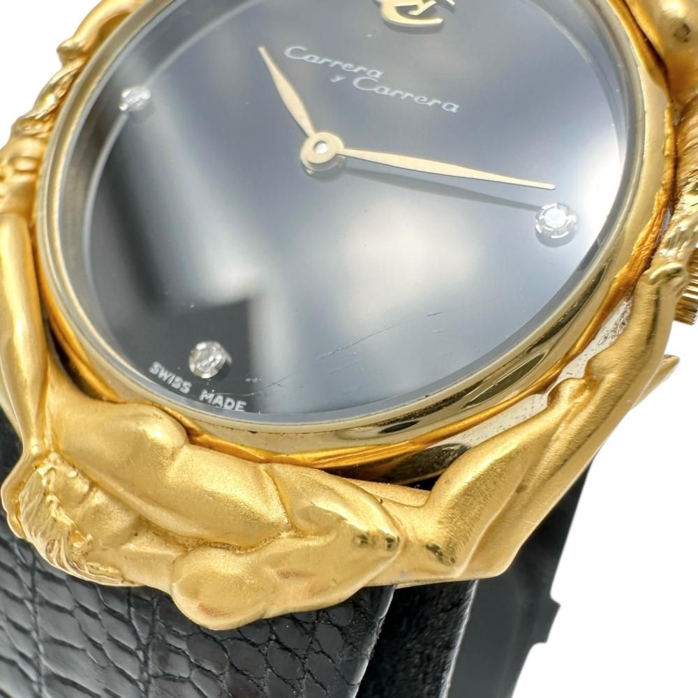 Carrera y カレライカレラ アダム-イブ バッテリー交換済 腕時計 K 18 YGイエローゴールド 18金 レザー クオーツ ゴールド文字盤 ブラックレザーベルト レディース