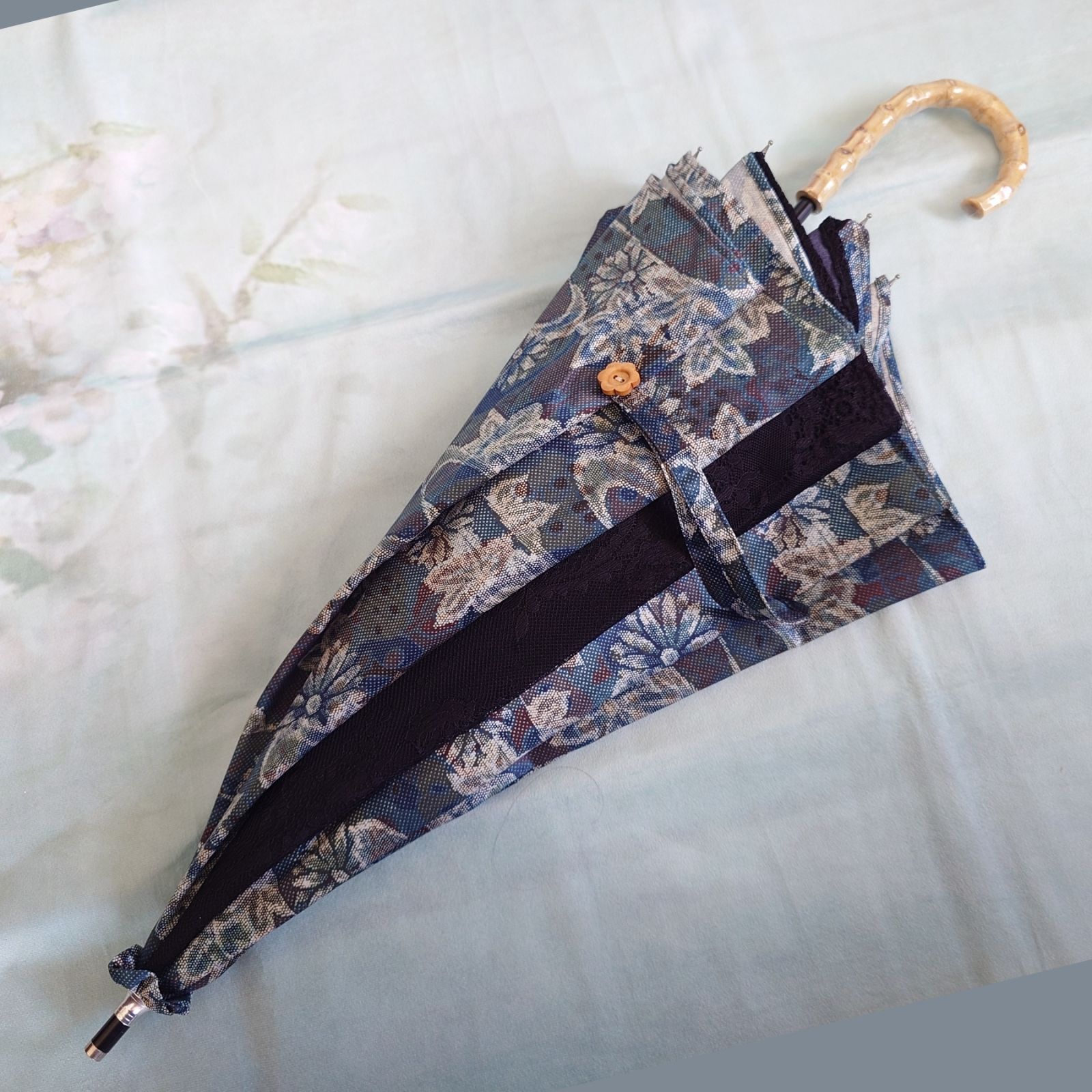 32 大島紬 日傘 ワンタッチオープン コサージュ&ヘアゴム付 着物リメイク