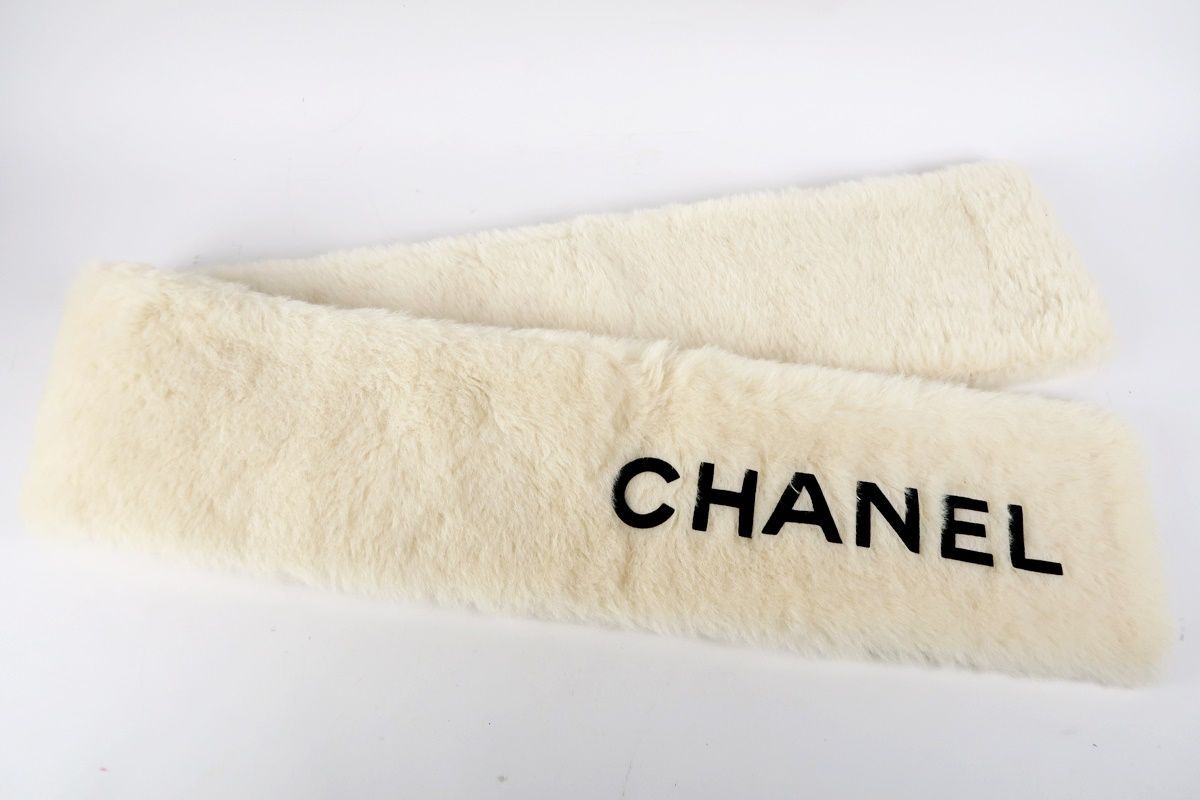 超 CHANEL シャネル アルパカ マフラー ファー ホワイト系 ストール ココマーク QE 56