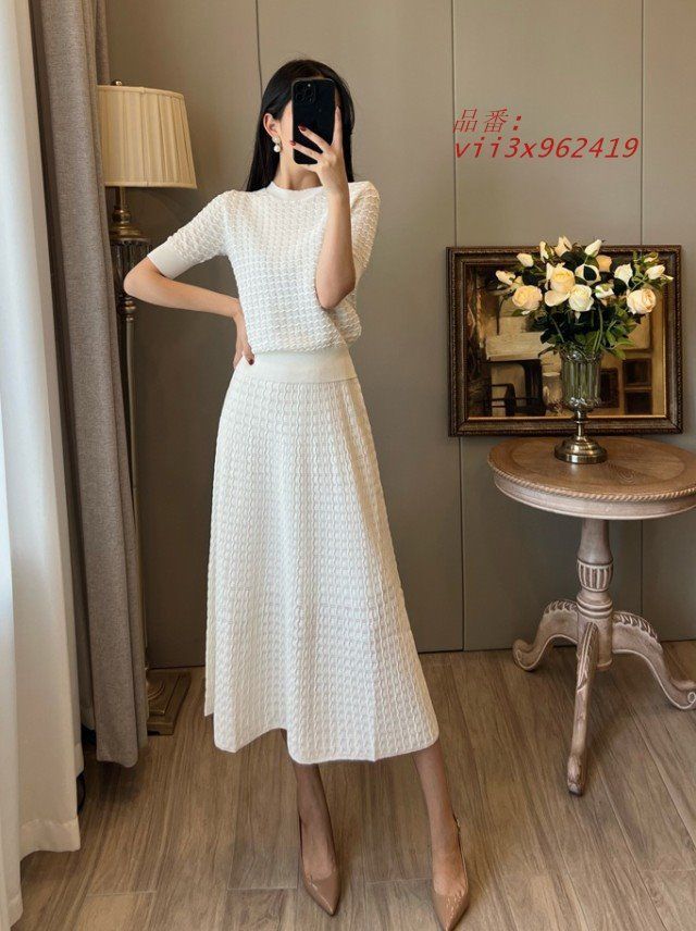 セットアップ レディース サマーニット きれいめ 半袖ニット 五分袖 白 ミモレ丈 シンプル オフィス 黒 Aライン 大きいサイズ 通勤服 ロング スカート vii 3 x 962419