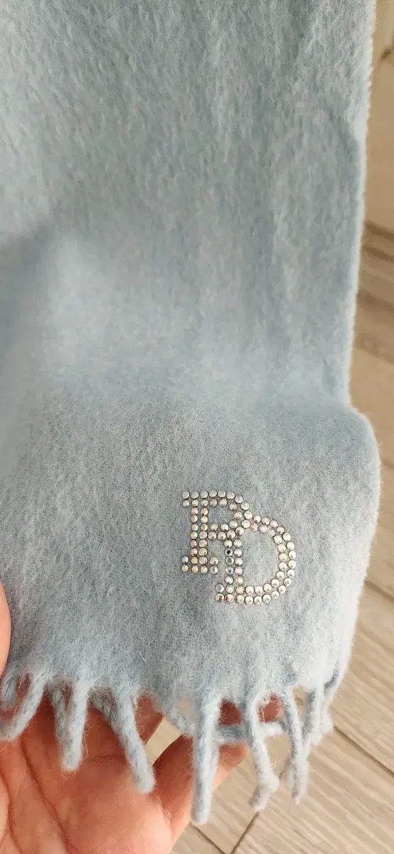柔らかいカシミア100%素材のスカイブルーのマフラーです。
