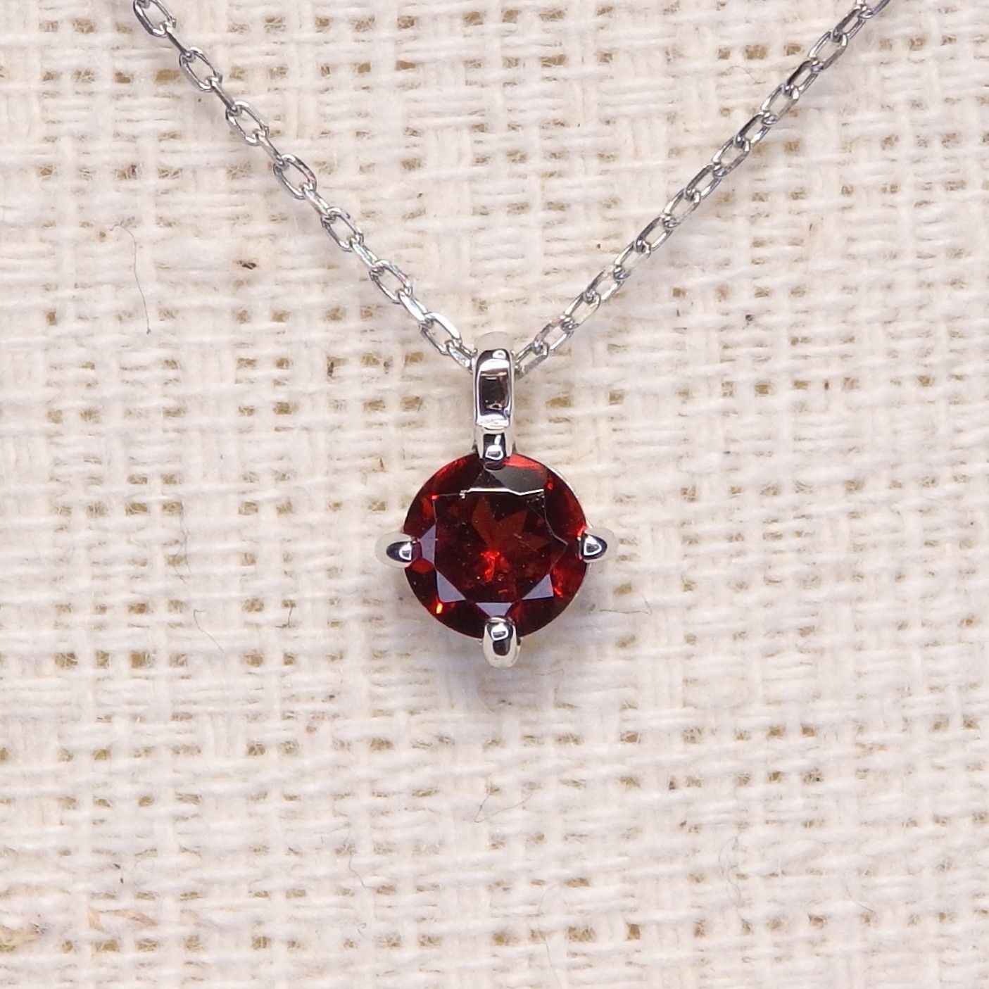 しっかりとした台座にセッティングされたラウンドカットのガーネット。