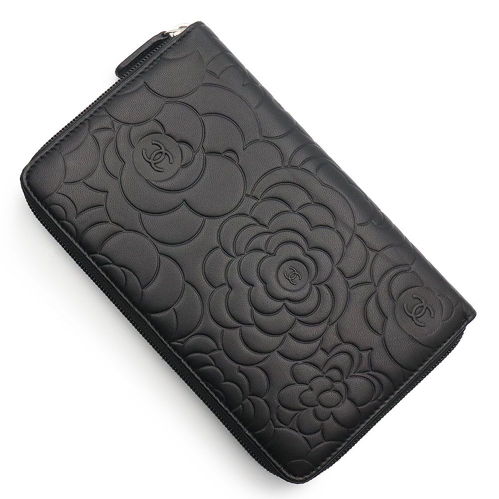 シャネル カメリアエンボス オーガナイザー ラージ ジップウォレット ラウンドファスナー 長財布 ラムスキン レザー ブラック シルバー金具 A 50932 CHANEL