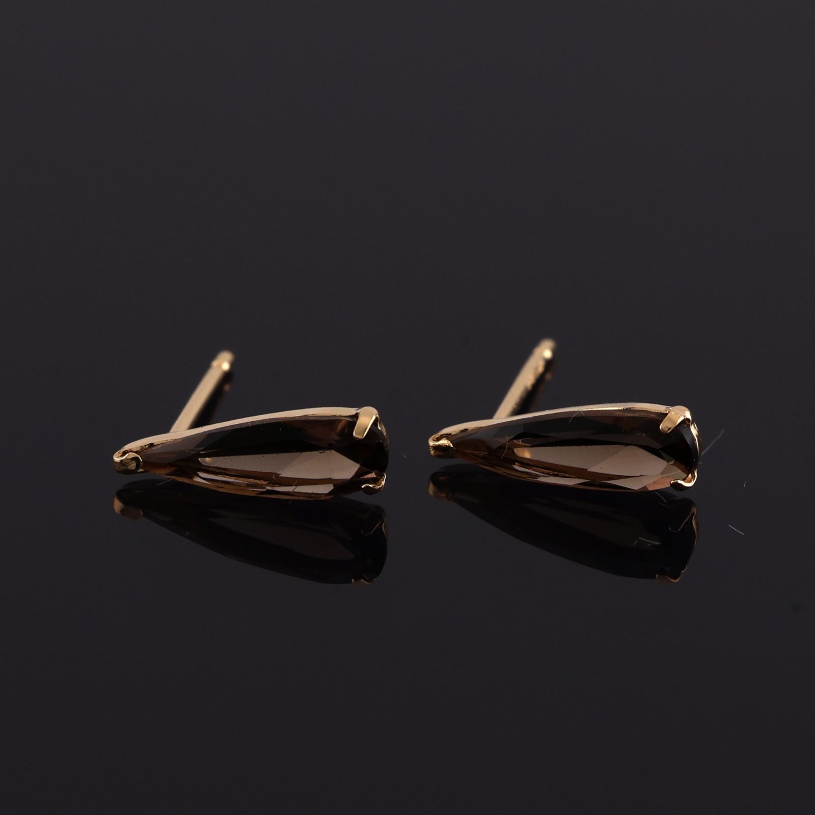 高級感のあるK18ゴールドと、落ち着いた輝きを放つスモーキークオーツを組み合わせた、シンプルながらも洗練されたスタッドピアスです。縦に長い細身のしずく型のスモーキークオーツのシルエットは、耳元に上品な縦ラインを強調し、繊細でエレガントな印象を作ります。その特有のシックで透明感のあるブラウンカラーが、光の加減で微妙に色合いを変えて、落ち着いた雰囲気を演出します。どんな肌色にも調和し、オフィススタイルにもカジュアルスタイルにも合わせやすい万能カラーが魅力です。その輝きを最大限に引き出すために、石留めには極力主張をおさえた3本爪を採用し、スモーキークオーツの美しさを際立たせています。K18ゴールドの輝きとスモーキークオーツの魅力が詰まったピアスは、本物志向の方におすすめです。どんなシーンにも溶け込むシンプルでシックな輝きを、是非毎日のコーディネートに取り入れてみてください。