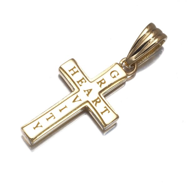 上質ダイヤモンドが輝くシンパシーオブソウルのクロスペンダント。もう片面には「Gravity Heart」のメッセージが刻まれたリバーシブルデザインです。