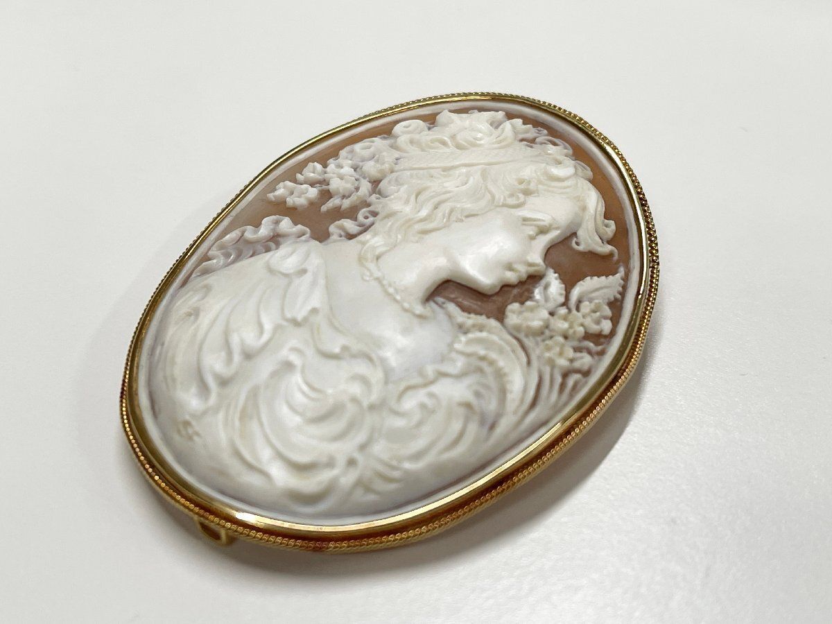ヴィンテージ カメオ ブローチ シェル 18 K 重さ14.9 g レトロ ペンダントトップ 2 Way 浮き彫り 縦6 cm 横4.7 貴婦人 女性肖像 他400