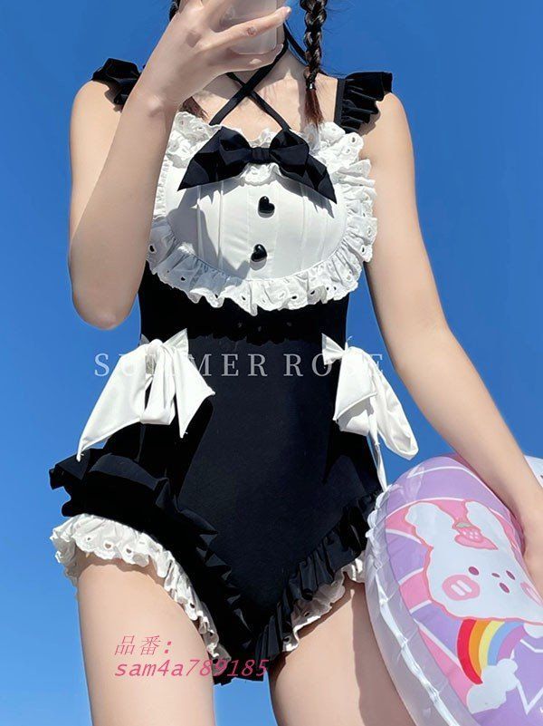 レディース 水着 レオタード水着 パッド付 かわいい メイド リボン フリル 小胸 夏 海 ビーチ プール 温泉旅行 S M L XL T2W9
